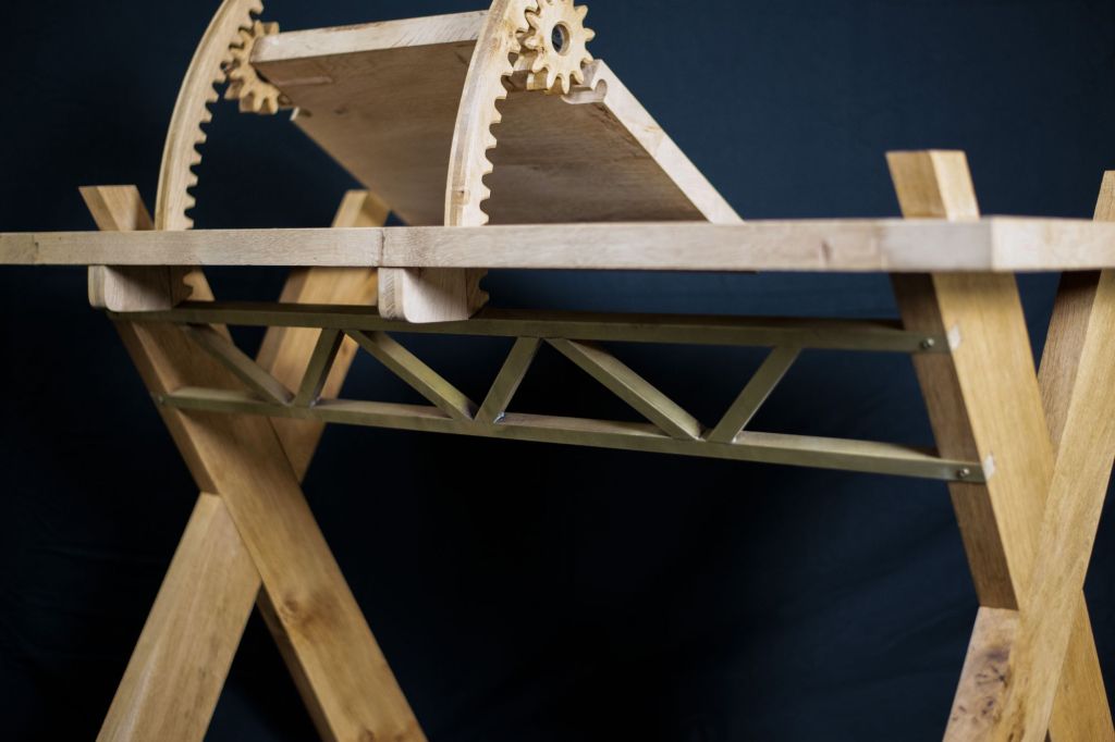 This desk is the signature piece behind the inception of Sam Alton Woodwork. This physics inspired writing desk comprised of figured oak and a planetary gear ramping system supported by a brass stretcher.